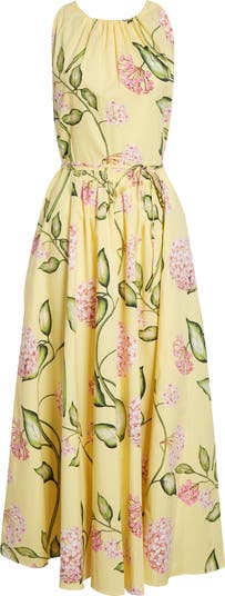 Blooming branches vine across this butter-yellow dress fashioned with a gathered neckline and wrapped with an apron-style skirt fastened with narrow ties.