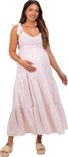 Embrace effortless style with our Floral Striped Smocked Shoulder Tie Maternity Maxi Dress. Featuring a flowing silhouette and lightweight fabric, this dress keeps you cool and comfortable throughout your pregnancy. The charming stripes are accented with delicate florals for a timeless look, while the smocked bodice and adjustable shoulder ties ensure a perfect, flexible fit as your bump grows. Ideal for baby showers, brunches, or everyday wear, it pairs beautifully with sandals or wedges for a chic, feminine ensemble. Transition seamlessly from day to night in this must-have maternity maxi.