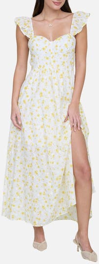Billowy ruffles trace the shoulders of a sweet floral sundress with a corset-style bodice and slit midi skirt.