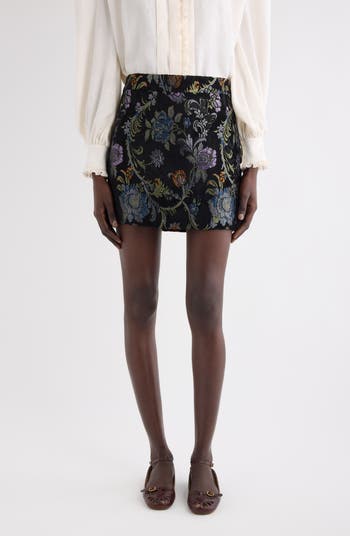 Floral jacquard inspired by classic tapestries brings retro charm to this silk-kissed miniskirt.