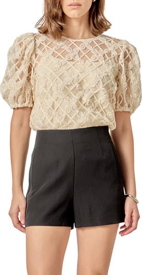 Swirling ribbons of blooms romance this semisheer top charmed by voluminous puff sleeves.