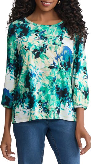 A relaxed silhouette brings effortless ease to this vibrant floral top framed by three-quarter-length sleeves.