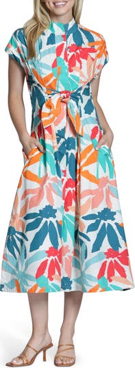 A carnival of color tells a flowery style story for a sash-cinched dress cut from cool cotton.