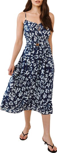 A tie-front bodice and sweetheart neckline bring soft structure to this floral midi dress, while an elasticized waist adds figure-flattering definition.