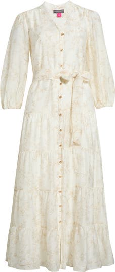 A barely there floral print adorns this flowy and romantic tiered maxi dress framed by three-quarter sleeves and fronted by glossy domed buttons.