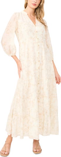 A barely there floral print adorns this flowy and romantic tiered maxi dress framed by three-quarter sleeves and fronted by glossy domed buttons.
