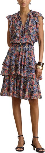 Showered in flowers and tiered in rows of ruffles, this deeply charming dress will be a summery favorite.