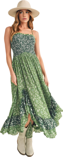 The Knit & Lounge green floral maxi dress exudes effortless femininity with its soft tiered layers and breezy flow. Featuring a fitted smocked bodice and delicate spaghetti straps, it's perfect for warm days and chic getaways.