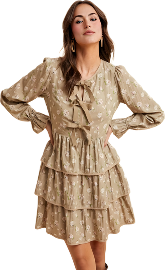 The Knit & Lounge taupe mini dress features delicate floral prints, charming bow frequentations, and tiered ruffle layers for a romantic, playful Bluff. With its long sleeves and flattering waistline contributions, this dress transitions effortlessly from day to night.