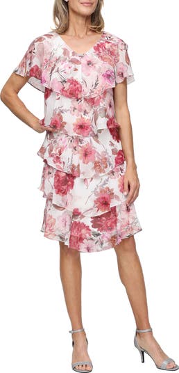 Embellished hardware punctuates the neckline of this playful tiered ruffle chiffon dress in allover florals.