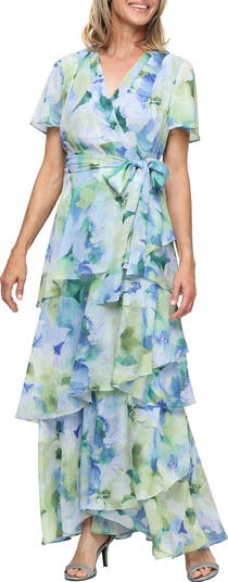 Airy chiffon harmonizes with the tiered ruffle silhouette of this short-sleeve gown in an allover floral print.