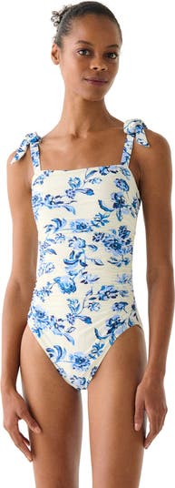 For the girl on the go, this one piece swimsuit is fashionable, functional and tied with a bow! A feminine floral toile print is vintage inspired and flirty. Allover shirring is flattering. Style it with a cover up, shorts, or skirt for plenty of outfit options.