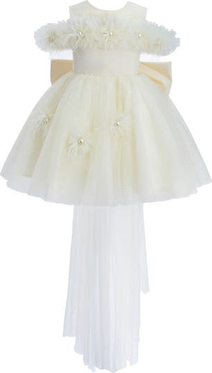 A breathtaking choice for formal occasions, this dress features a layered tulle skirt, floral appliqués, and a dramatic sheer train. The puff sleeves and oversized back bow add a regal touch to its fairytale charm.
