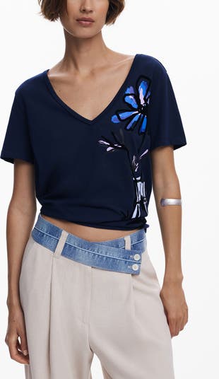 A doodle-inspired floral design pops against a dark background on this relaxed V-neck T-shirt made from soft cotton.