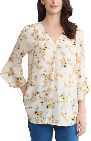 Pretty poppies populate a flowy crepe top framed by a lightly pleated neckline and fluttery three-quarter sleeves.