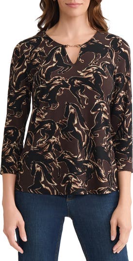 A goldtone bit accent bridges the V-neckline on this floral-printed jersey top that moves from workplace to weekend with ease.