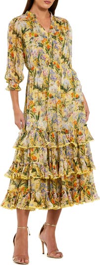 Floral V-neck midi dress with ruffle tiers and 3/4 sleeves. Designed with a flattering waist and flowy silhouette, perfect for daytime events, brunch, and special occasions.