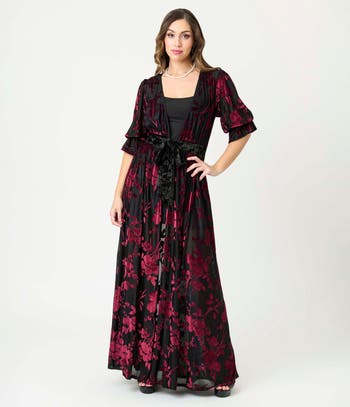 Crafted in a beautiful velvet floral burnout, this 1950s style duster boasts a V-neck and three-quarter length sleeves, embellished with ruffles. Complete with an open front and floor-length maxi skirt.