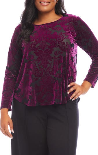A tunic length and curved hem enhance this velvety long-sleeve top covered in a romantic floral burnout design.