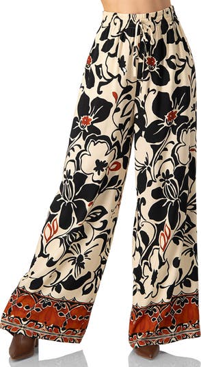 Wide-legged floral print trousers with waist elastic.