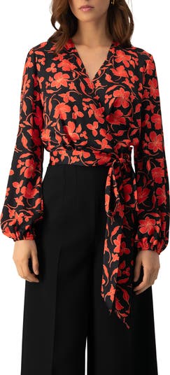 - A sophisticated wrap-style blouse with a vivid red floral print on a black background. Featuring long sleeves with gathered cuffs and a tie at the waist, this piece enhances the silhouette while adding a touch of modern elegance.