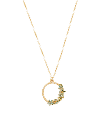 Reminiscent of garden parties, the Floral Wreath Necklace has a nostalgic and romantic feel to it. Hand-painted aqua-blue flowers and delicate white jewels rest gracefully on a round pendant, accented with deep green leaves for a touch of elegance. Crafted in 22ct worn gold-plated brass, the fine adjustable chain makes this piece perfect for layering.