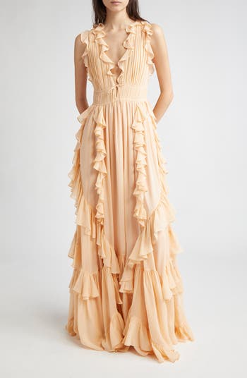 Cut from rich silk, this ethereal sleeveless maxi is romanced by floaty cascading ruffles and finished with a flowy floor-sweeping skirt.