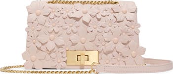 Whimsical floral appliqués bloom along the flap of a structured faux-leather bag featuring a pull-through chain strap that converts for shoulder or crossbody wear.