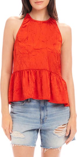 Glossy crushed satin adds gorgeous texture to this sleeveless top cut in a relaxed fit and finished with a flounce.
