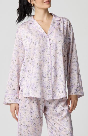 Sweet dreams await in this comfortably oversized pajama shirt offered in fun colors and patterns. Pearlescent buttons and classic piping complete the luxe look of this silky satin style.