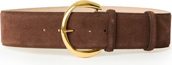 A sculptural buckle gleams against the velvety suede of a broad belt that quickly cinches your look.