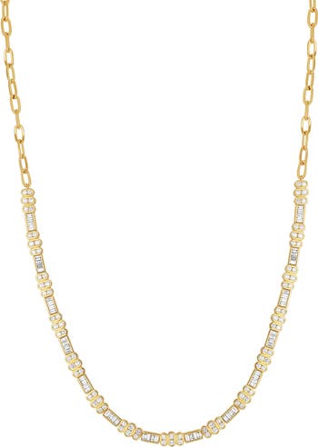 Geometric settings house circular and baguette-cut diamonds to give classic-meets-contemporary shape to this 18-karat-gold necklace.