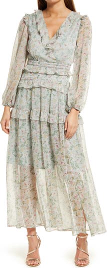 Be the source of romance in the air with a prairie-inspired maxi decked with ruffles, dappled with wildflowers and laced-up, alluringly, at the back.