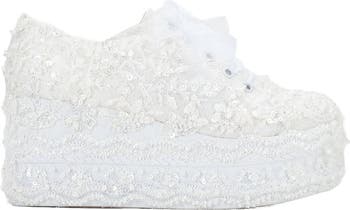 Congratulations on your big day! If you're looking for a comfortable yet glamorous option for your wedding shoes, Florette Bridal Platform Sneakers from Forever & Always Shoes are the perfect fit for you. These wedding sneakers feature a 2.7-inch outsole height (7 cm). The ivory-colored upper is adorned with meticulously handcrafted lace crochet and pearl details, adding an elegant touch to every step you take. The sheer ribbon shoe laces add to the elegance of the sneakers, making them a perfect choice for any bride who wants to be comfortable but still look glamorous on her special day. Whether you're looking for a unique way to express your style or simply want to keep your feet comfortable during your wedding reception, these wedding sneakers are a perfect choice. These shoes are designed to fit true to size, so we recommend ordering your regular size.