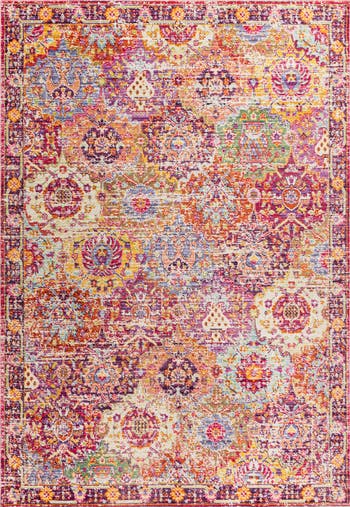 Layer on the Boho style with this colorful rug's all-over medallion design. Mingled fuchsia and burgundy with a faded effect give this rug a vintage, flea-market vibe. It's the perfect start to a vibrant color scheme in a bedroom, living room, entry, or dining area.