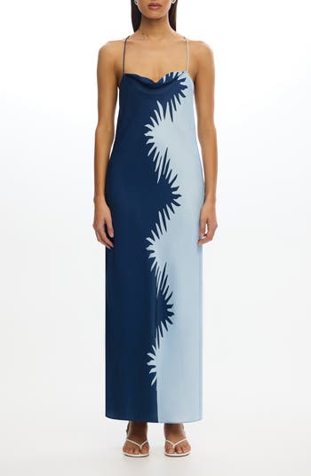 A striking print animates a bias-cut dress designed with a strappy back for a look that pairs perfectly with sunset cocktails.