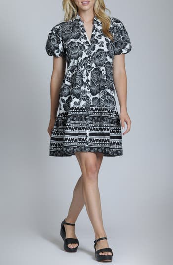 A black-and-white floral print defines this breezy button-up dress styled with short puff sleeves and a crisp spread collar. The tiered skirt adds movement, while a contrasting print at the hem creates a striking, artful finish.