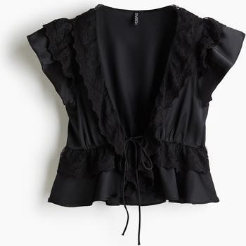 Short blouse in satin with a flounced lace trim around the neckline, at the waist and over the shoulders. Featuring a deep, V-shaped neckline, an open front with spaghetti ties at the centre of the bust, flounced cap sleeves and a gathered seam at the waist.