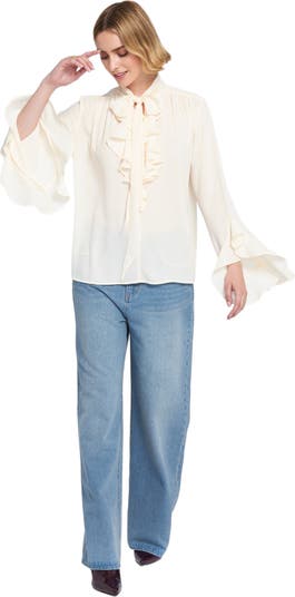 Dramatic flounced bell sleeves for an elegant silhouette. Feminine tie-neck detail with cascading ruffle trim. Lightweight, flowy fabric ideal for layering or standalone wear. Relaxed fit that flatters a variety of body types. Button-front closure hidden beneath ruffle detailing. Versatile style—perfect from office to evening.