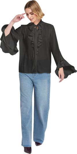 Dramatic flounced bell sleeves for an elegant silhouette. Feminine tie-neck detail with cascading ruffle trim. Lightweight, flowy fabric ideal for layering or standalone wear. Relaxed fit that flatters a variety of body types. Button-front closure hidden beneath ruffle detailing. Versatile style—perfect from office to evening.