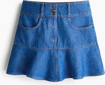 Mini skirt in cotton denim with front pockets and a zip fly with two metal buttons. Gently flared silhouette with a flounced hem.