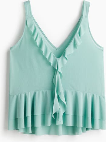Vest top in sheer jersey with wide shoulder straps and a deep V-neckline with a billowing flounce that continues down the front. Double-layered flounce at the hem.