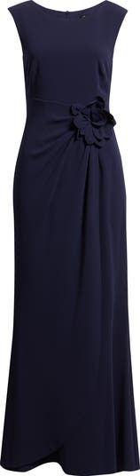 A dramatic flower appliqué at the waist creates elegant gathering and draping on this floor-sweeping gown made from comfortable jersey.
