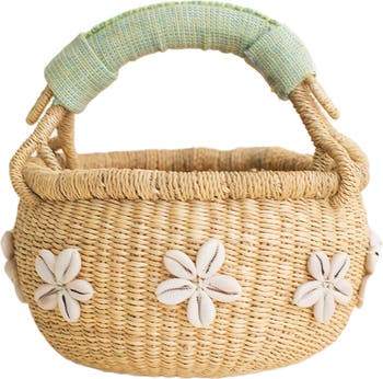 The Flower Bolga in Green is a playful mini basket that can be used for various occasions big or small! 4" W x 6.5" H (3.5" Handle Drop) Natural color accented with a light green handle Made from 100% elephant swamp grass The basket weave fabric handle is hand loomed in Burkina Faso using locally grown, organic and fair trade certified cotton Adorned with cowrie shells - treasured symbols of destiny, prosperity, and strength The ideal storage basket for your small everyday essentials or an adorable first handbag for a little girl.