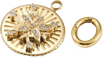 A floral motif brings dimension and sparkle to this round charm and connector ready to enhance your favorite chain.