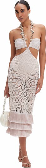 - This midi dress features a plunging halter neckline with shell embroidery throughout into a fitted crochet skirt with flattering side cut outs. Built in bodysuit for partial lining and layered fringe trims along the hemline. Open back design with a tie at the neck and clasp at the mid back. Made in China. Crochet 100% CottonLining: 81% Polyamide: 19% Elastane. VEM31837. :