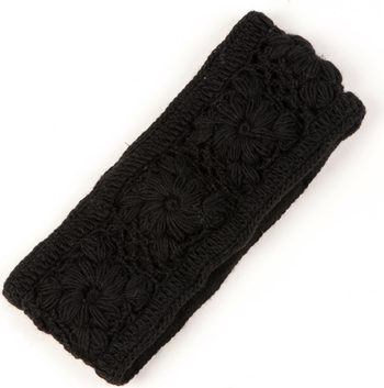100% wool headband with fleece lining and flower crochet knit design. Handmade in Nepal.