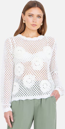 This airy jumper features an open-knit mesh design that feels light, fresh, and effortlessly stylish. Decorated with large, textured floral motifs, it blends a modern, breathable look with soft, feminine detailing. The relaxed silhouette, scalloped trim, and long sleeves make it a perfect layering piece for warmer days or breezy evenings.