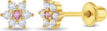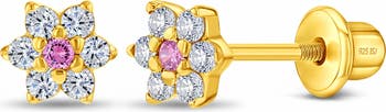 The sweetest present for a young girl growing her collection. Beautifully designed with small cubic zirconia stones all throughout, this flower shaped screw back earring is one that she will love. Made from 14k gold over sterling silver, these flower stud earrings are hypoallergenic and safe for the youngest girls with sensitive skin. The screw back closure mechanism allows for the earring to remain safely in place during sleep and play. Arrives in a small gift box for an easier gifting experience.
