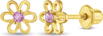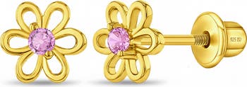 These little girls flower shaped earrings are crafted from 14k gold over sterling silver for a timeless, elegant look. Each delicate flower design features a sparkling cubic zirconia stone at the center, adding just the right touch of shine. Designed with safety screw back closures, these earrings provide a secure and comfortable fit for everyday wear. A sweet and charming accessory perfect for special occasions or daily styling. A gift box is included with purchase.